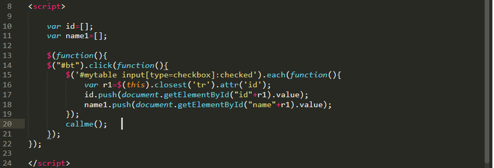 - Line 14: This will store the id of the <tr> in r1, of which the checkbox is active.